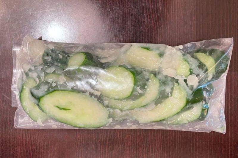 2. ポリ袋にきゅうりと塩麹を入れてもみ込んだ後ポリ袋の空気を抜き、冷蔵庫にいれて一晩寝かす。
